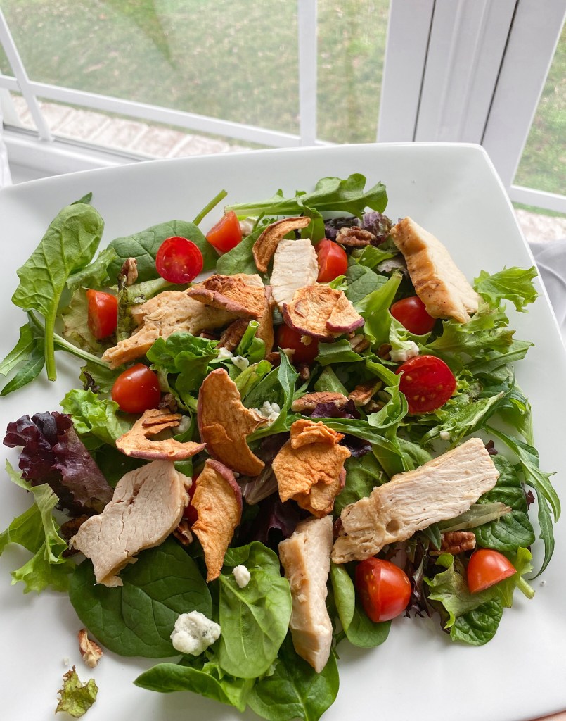 Well on the original Panera Salad, it starts with a bed of red leaf lettuce blend. Then it is topped with grilled chicken, cherry tomatoes, pecans, Gorgonzola cheese, red onions, dried apple chips, and their signature apple dressing! All of which can be found at the grocery store!